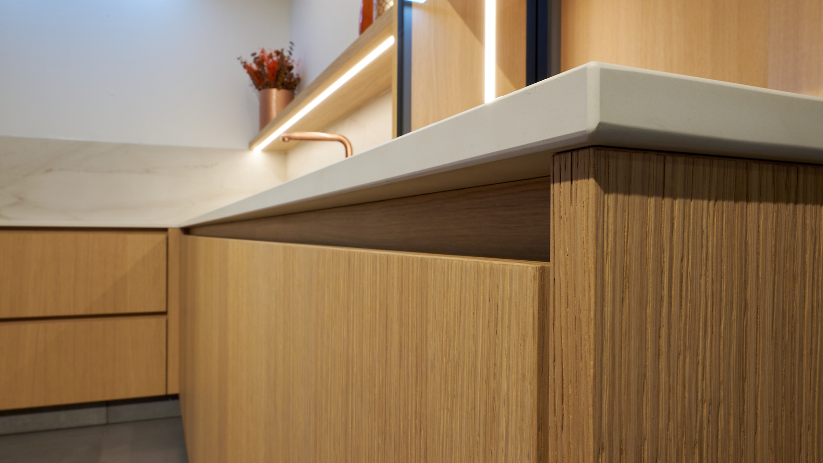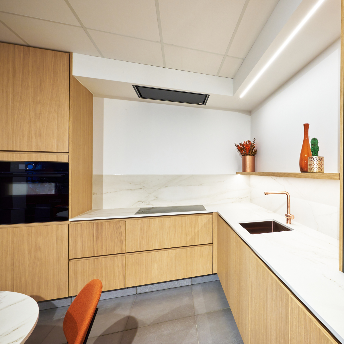 Deze keuken combineert natuurlijke materialen met moderne luxe. De licht eikenhouten kasten zorgen voor een warme uitstraling en worden perfect aangevuld door het marmerlook werkblad en de achterwand. De koperen spoelbak en kraan vormen een opvallend en stijlvol detail, wat de keuken een verfijnde touch geeft.