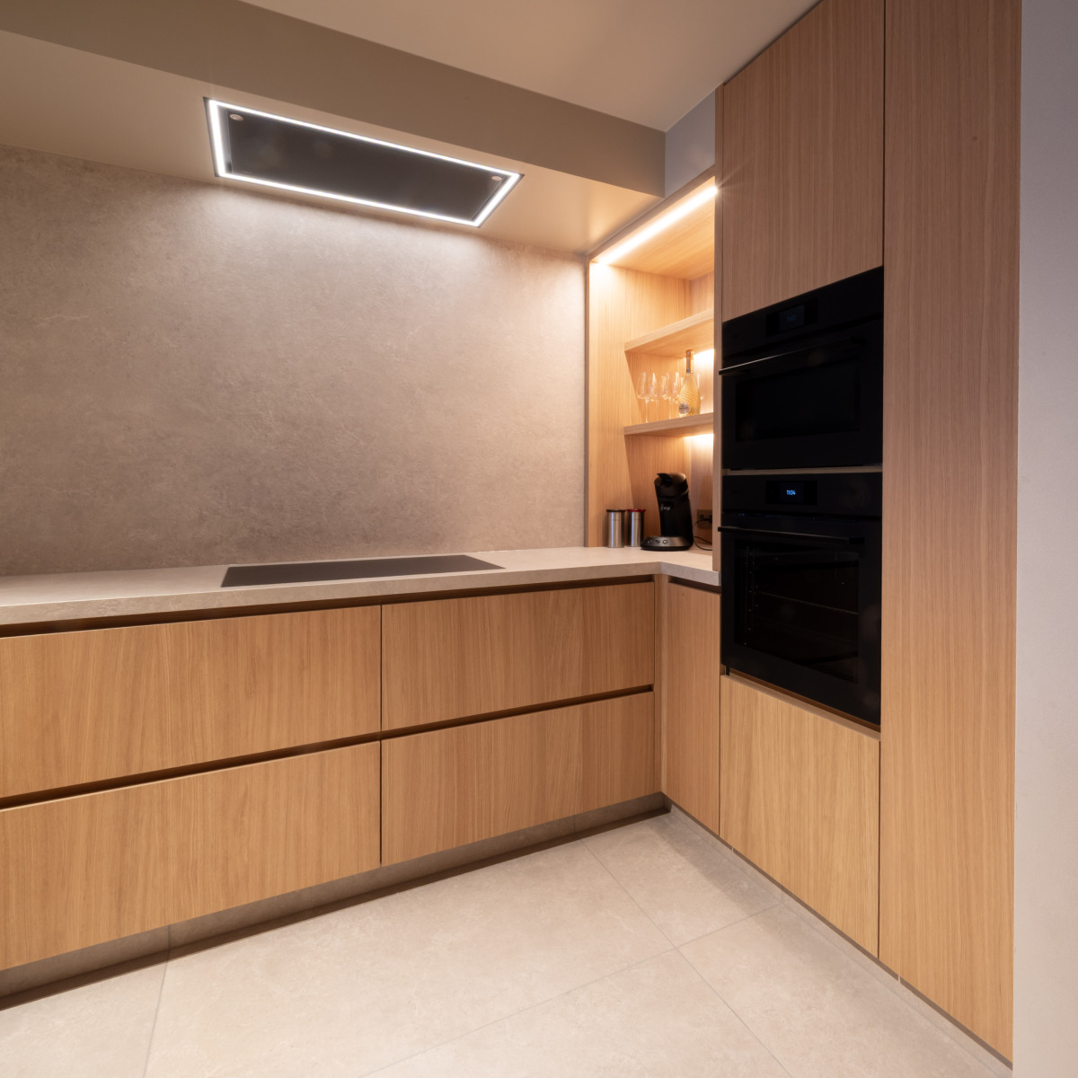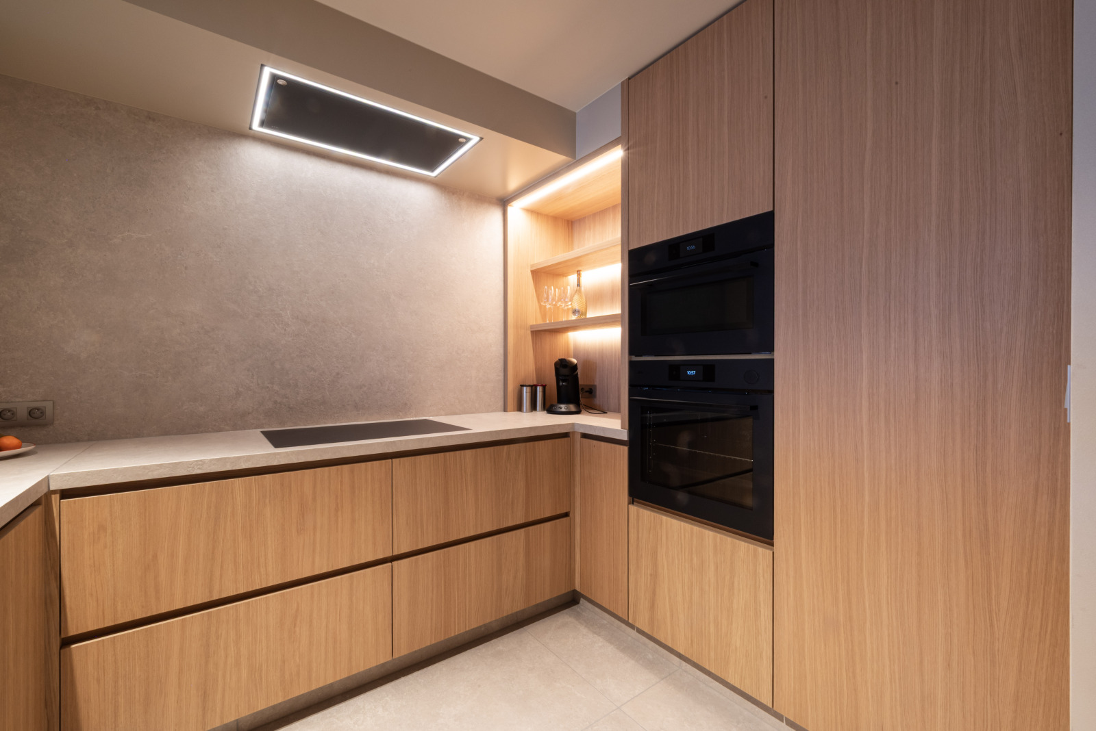 De verlichting is subtiel weggewerkt in de dampkap en boven de open nissen, wat zorgt voor een aangename sfeer en doordachte ingebouwde verlichting. Elk detail draagt bij aan een praktische indeling, met veel werkruimte en slimme opbergruimte. De centrale opstelling zorgt voor een vlotte flow tussen koken en tafelen, ideaal voor gezinnen of wie graag gasten ontvangt.