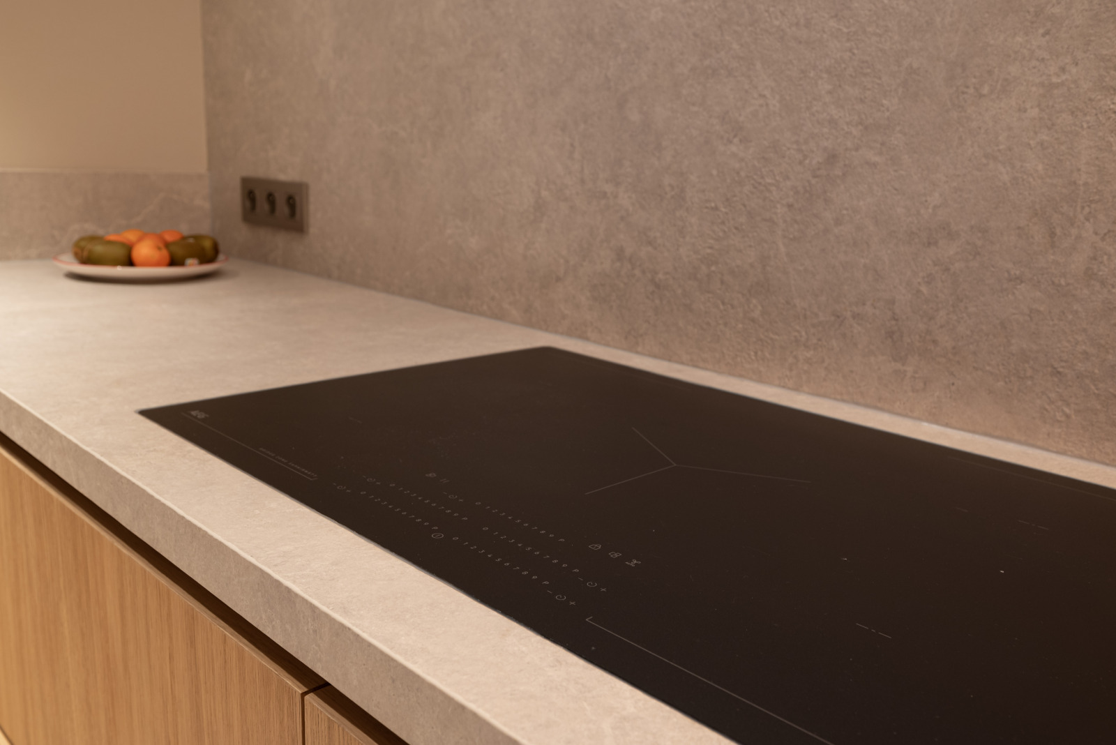 Deze tijdloze keuken met moderne look straalt rust, klasse en functionaliteit uit. Dankzij de warme houttinten en de strakke lijnen past deze keuken perfect in elk hedendaags interieur. De combinatie van een spatwand in betonlook, een werkblad in licht natuursteen en ingebouwde keukentoestellen zorgt voor een harmonieuze afwerking op maat.